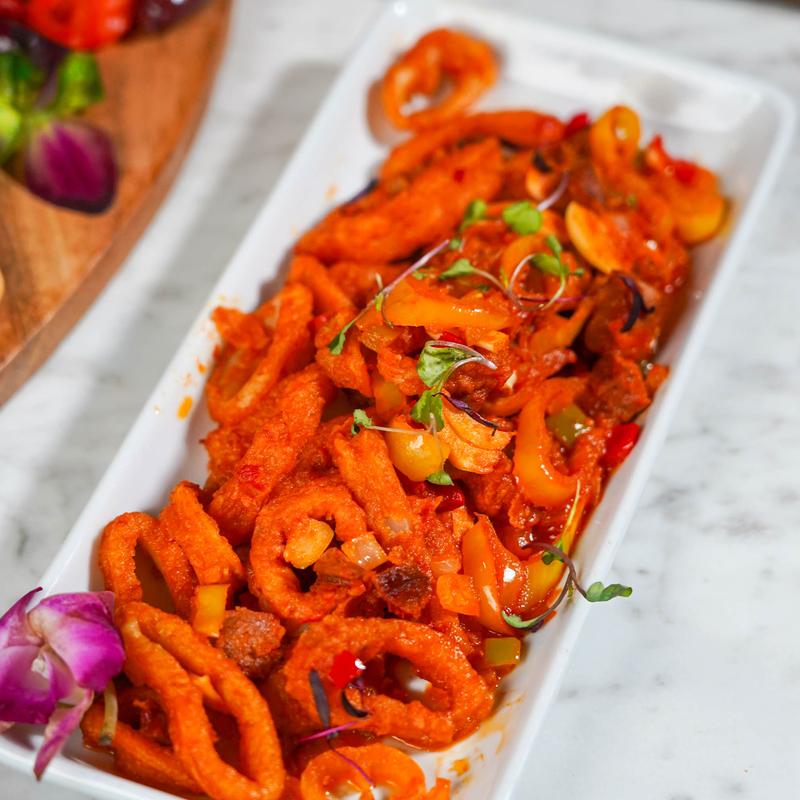 Tossed with sautéed chorizo, zesty banana peppers and garlic. Finished with a touch of marinara sauce. Served with a cool side of remoulade